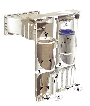 1-Cuve de pré-filtration 2-Cuve de filtration 3-couvercle avec soupape double effet brevetée 4-Circulation de l'eau 5-Raccordement a la pompe